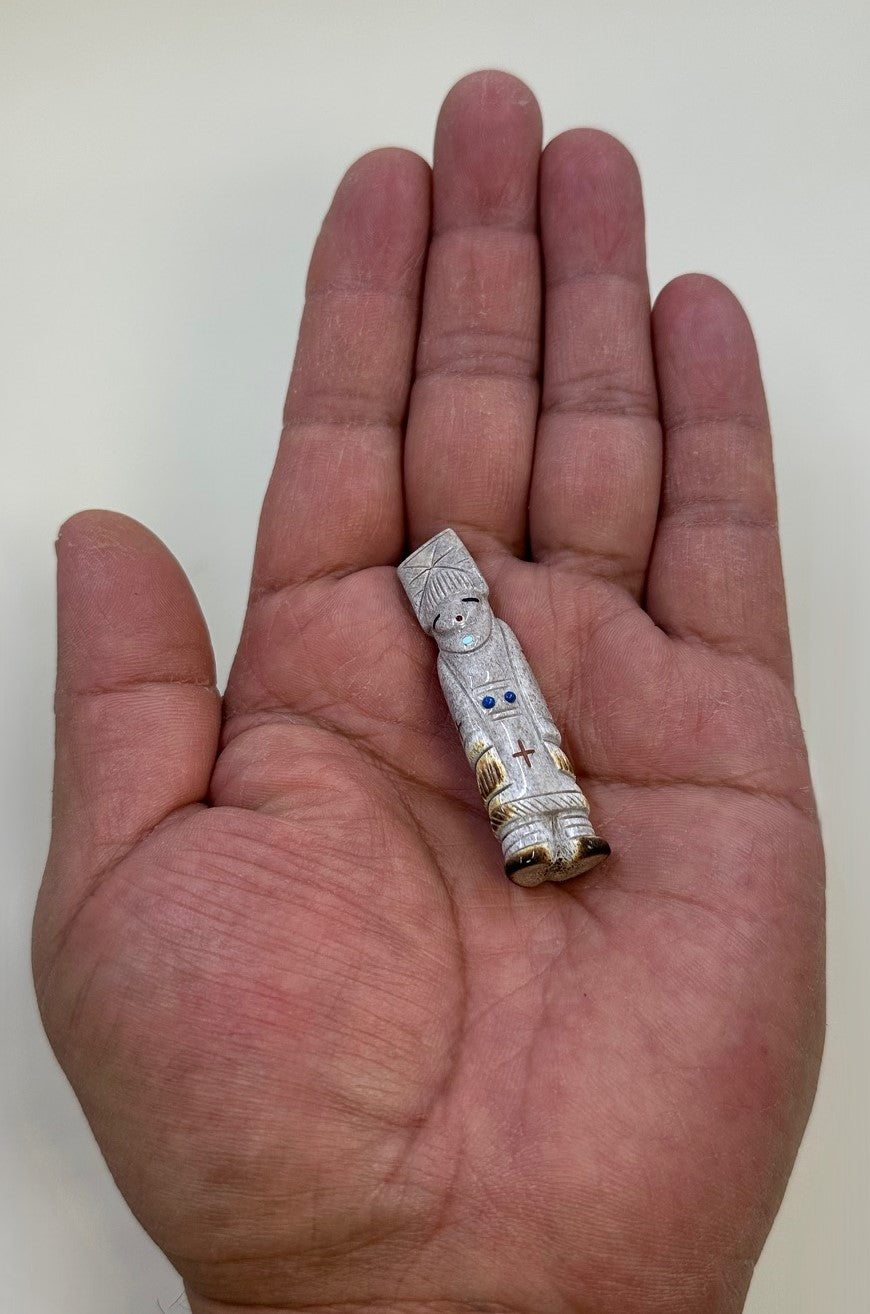 A Pueblo maiden wearing a headdress carved from a single piece of Deer Antler. The headdress and hair have incised detail. Her eyes are incised and inlaid with Black Jet pigment. Her mouth is inlaid with red Mediterranean Coral. A single stone of Sleeping Beauty turquoise highlights her necklace. An incised belt is inlaid with blue Lapis stones. Her dress and shawl are incised and inlaid with stars of Red Pipestone pigment and dragonflies of Black Jet pigment with red Mediterranean Coral inlay. The fringe detail on the shawl and helm of the dress is burnished for contrast. The moccasins are carved to detail the traditional white buckskin wraps and soles are burnished for contrast.