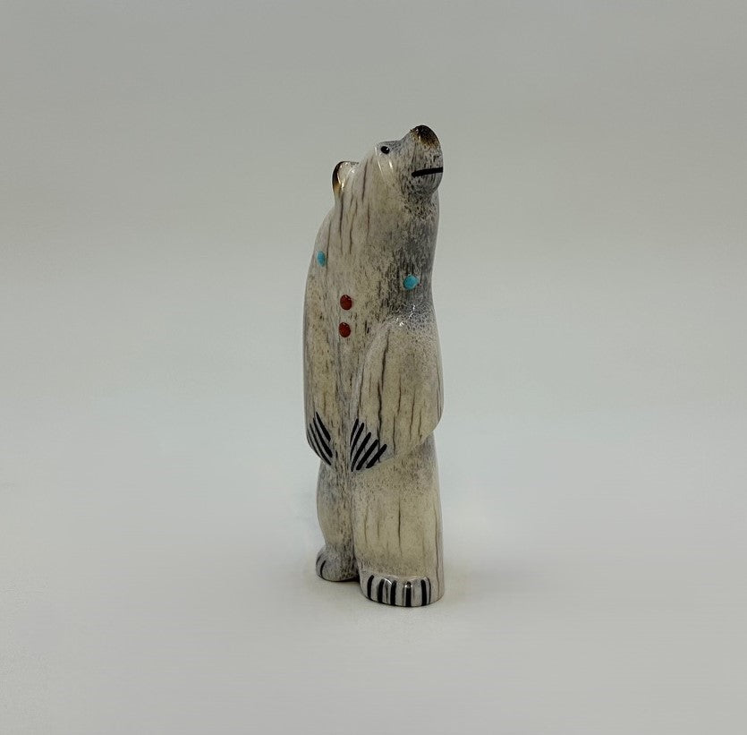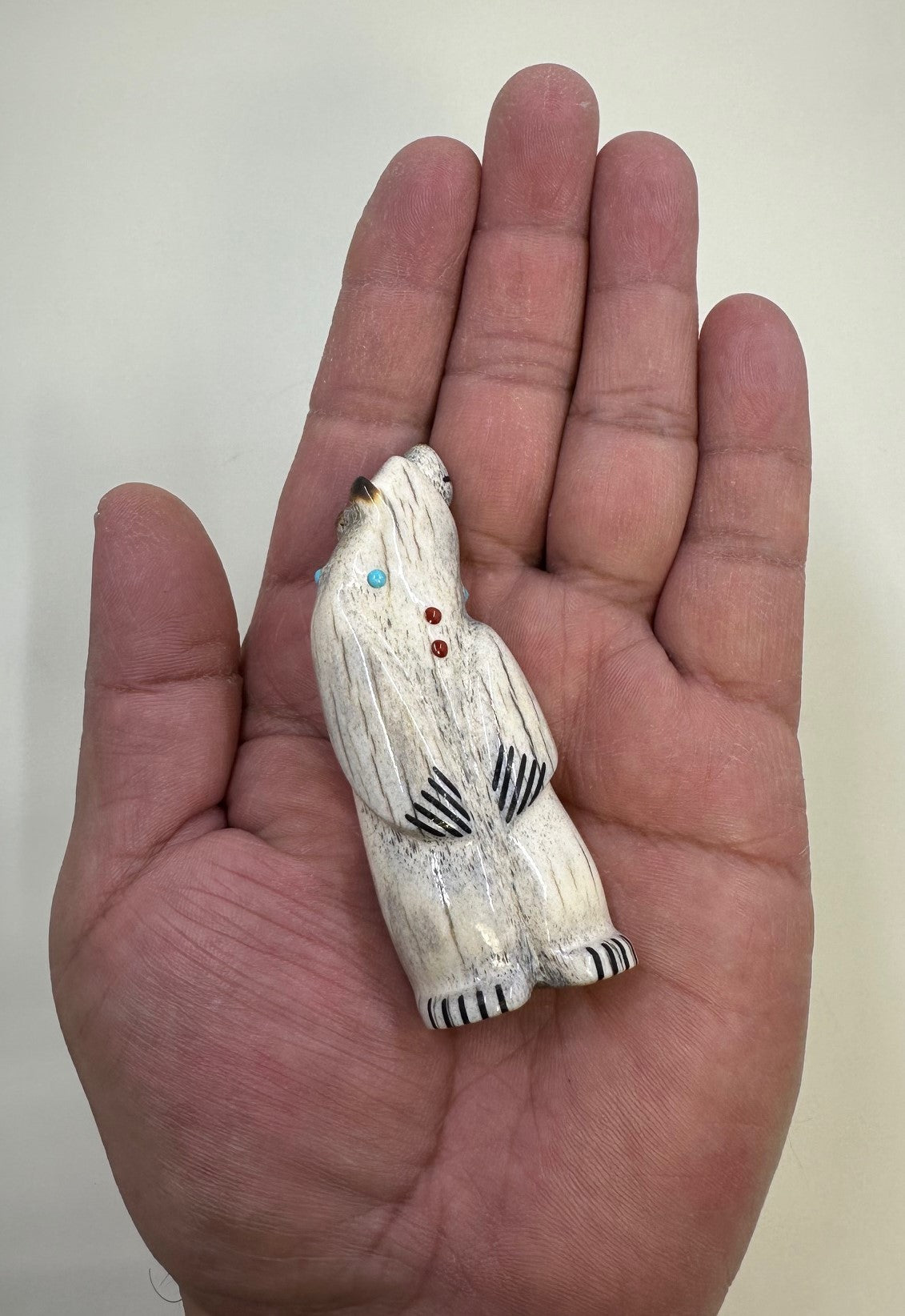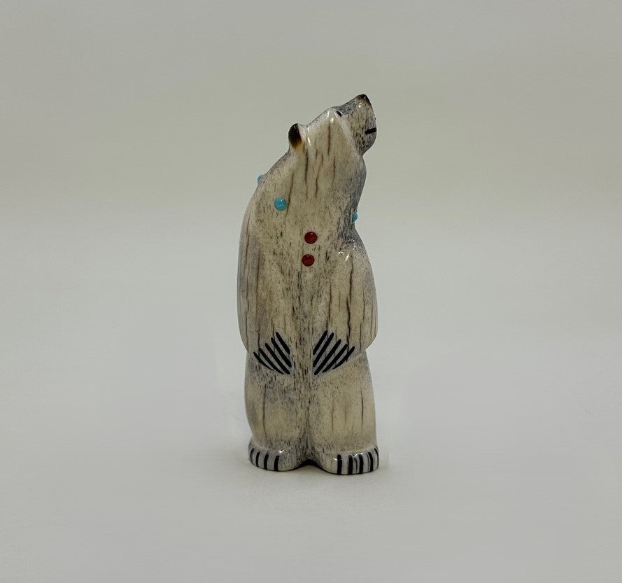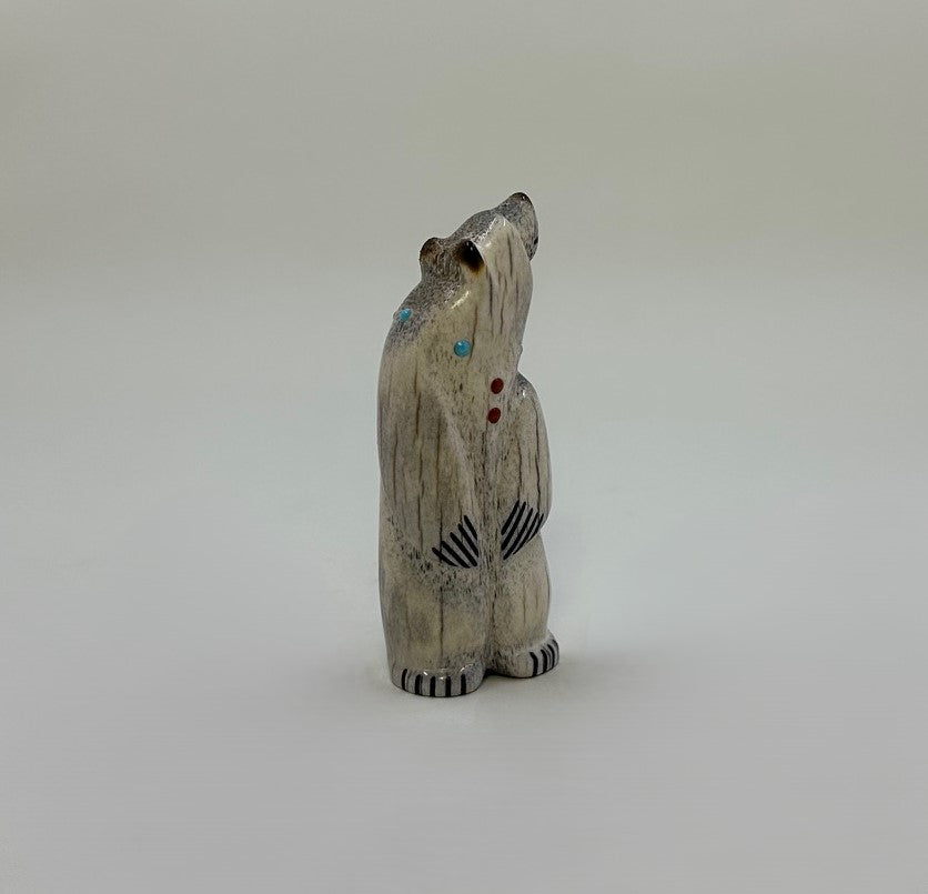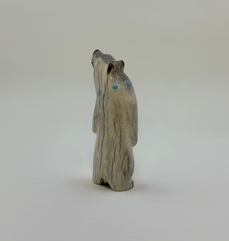 Hand carved of Elk Antler with attentive Black Pen Shell eyes. His smile and claws are inlaid with Black Jet pigment. The simple necklace is of Mediterranean Coral and Sleeping Beauty Turquoise. Finished with a burnished nose, ears and tail.