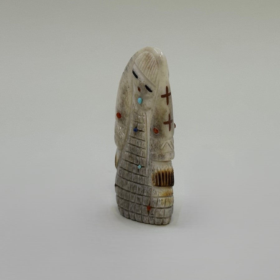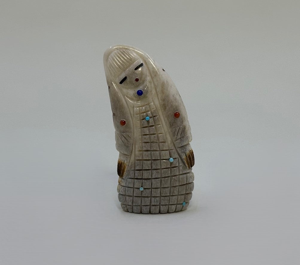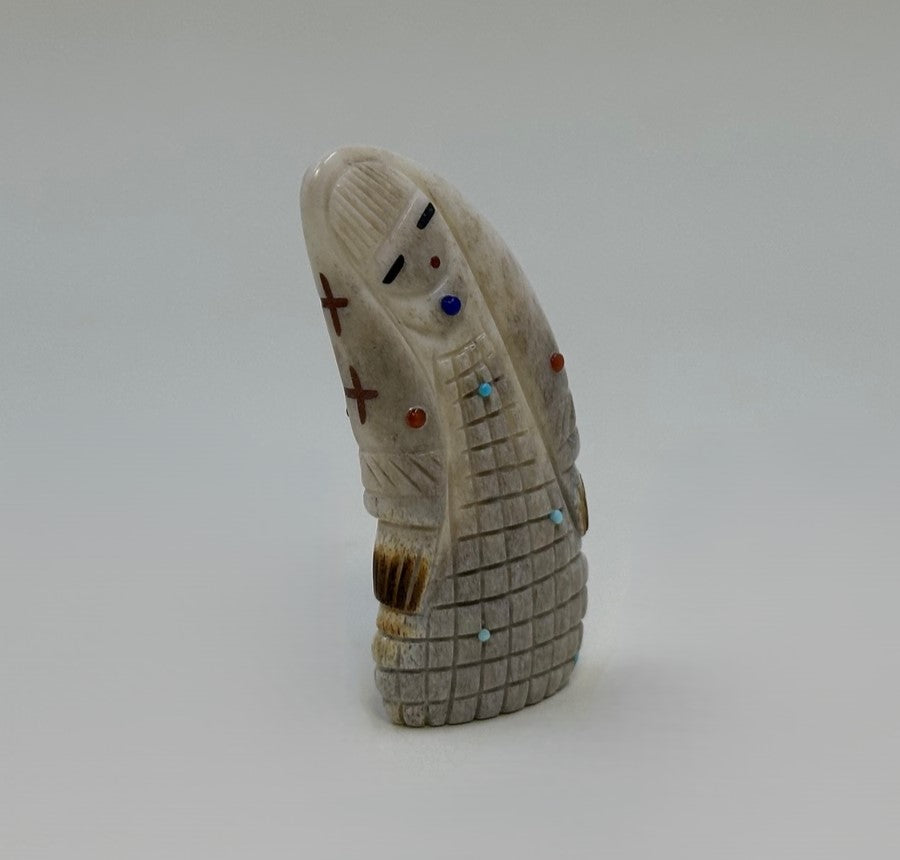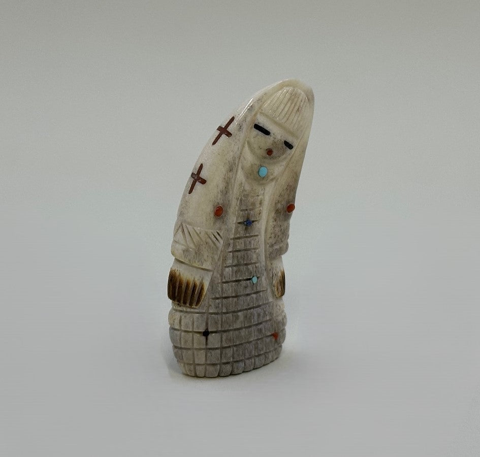 A double sided Deer Antler Corn Maidens with Black Jet pigment eyes and Mediterranean Coral mouths. They wear a shawl over the head to symbolize mother/grandmother hood. The ones that teaches the younger generations the knowledge they carry. The design on the shawl are symbols of soft rain coming down with inlays of Mediterranean Coral drops and star symbols with Red Pipe Stone pigments. Blue Corn with inlays of Sleeping Beauty Turquoise and the other is a multi-color corn with inlay of Lapis, Sleeping Beauty Turquoise, Mediterranean Coral and Black Pen Shell. The fringe is burnished to give color.