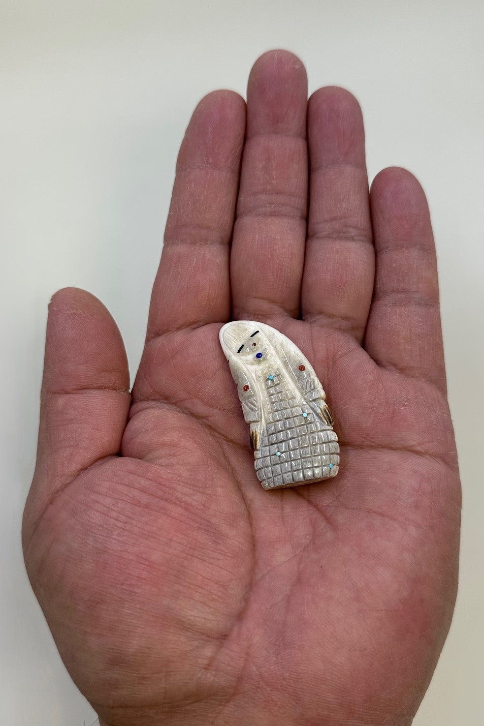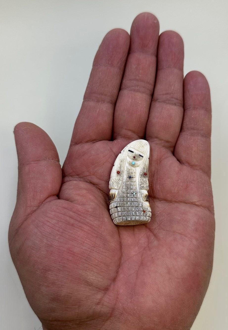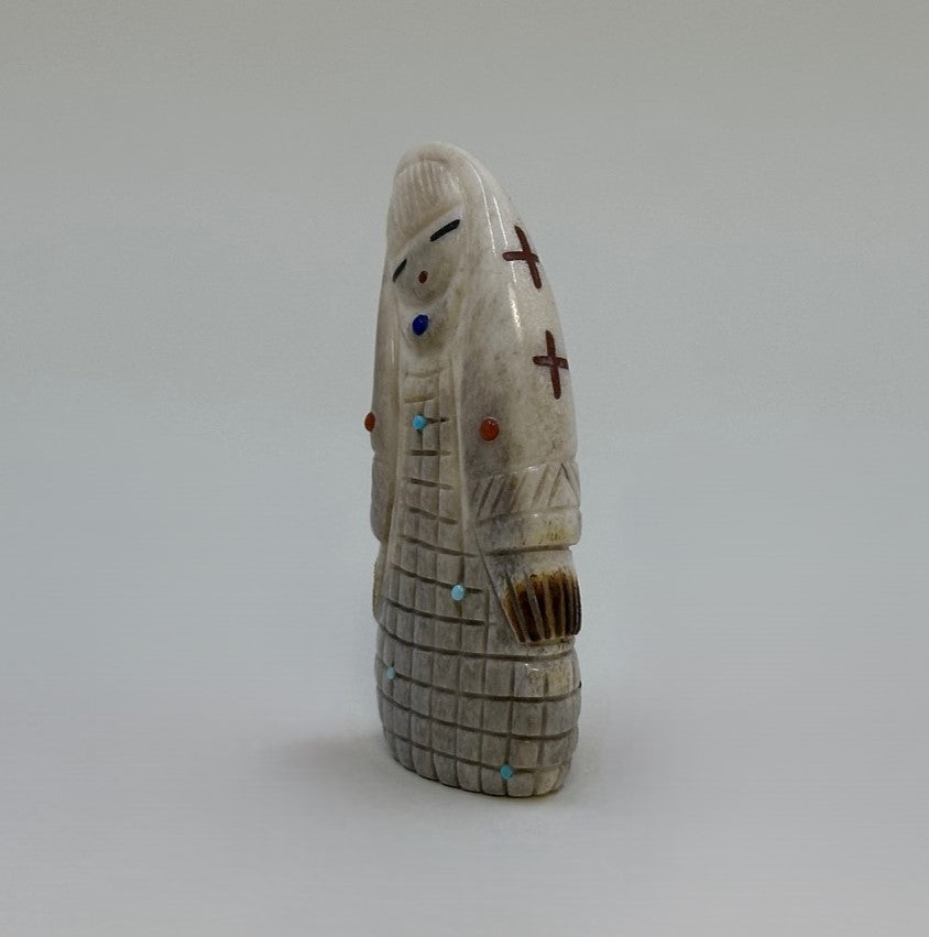 A double sided Deer Antler Corn Maidens with Black Jet pigment eyes and Mediterranean Coral mouths. They wear a shawl over the head to symbolize mother/grandmother hood. The ones that teaches the younger generations the knowledge they carry. The design on the shawl are symbols of soft rain coming down with inlays of Mediterranean Coral drops and star symbols with Red Pipe Stone pigments. Blue Corn with inlays of Sleeping Beauty Turquoise and the other is a multi-color corn with inlay of Lapis, Sleeping Beauty Turquoise, Mediterranean Coral and Black Pen Shell. The fringe is burnished to give color.