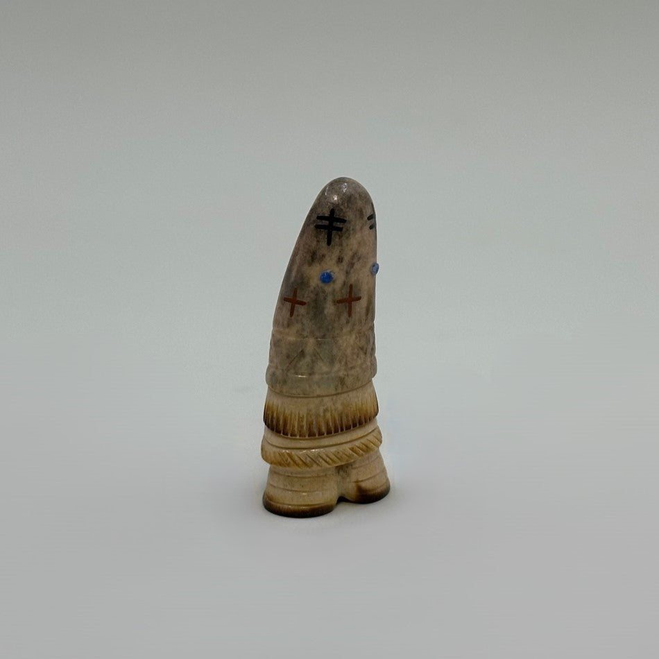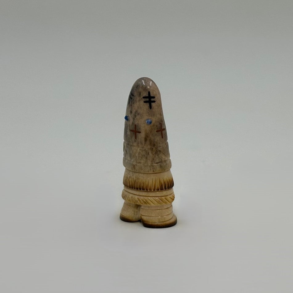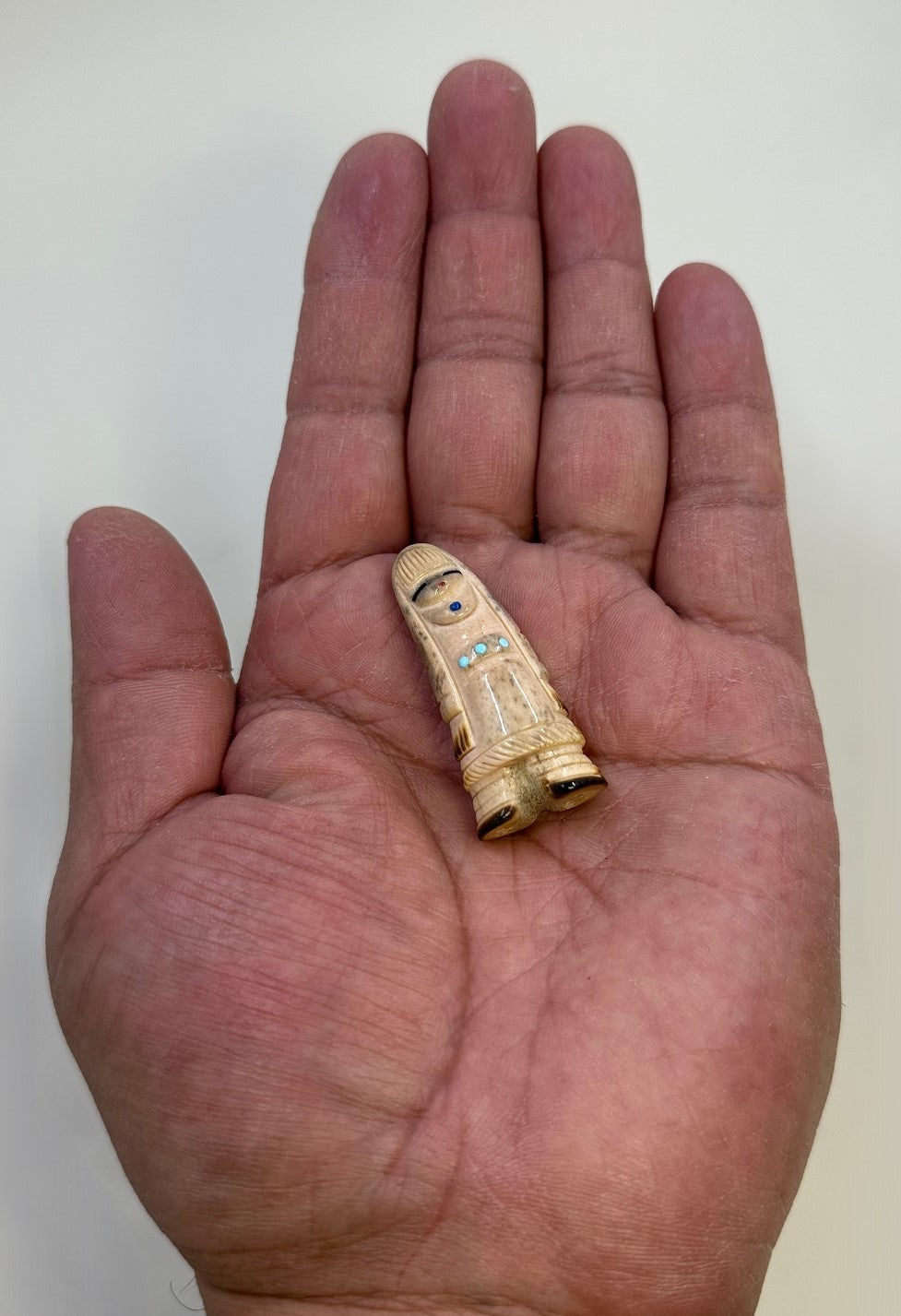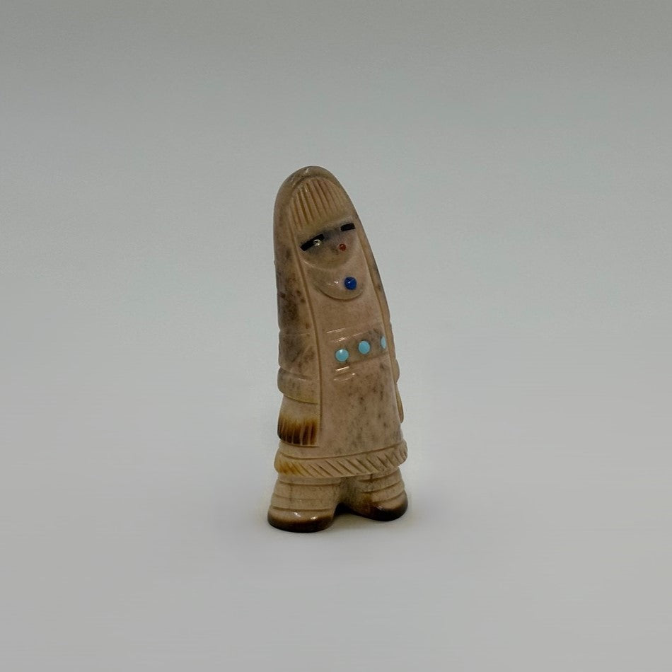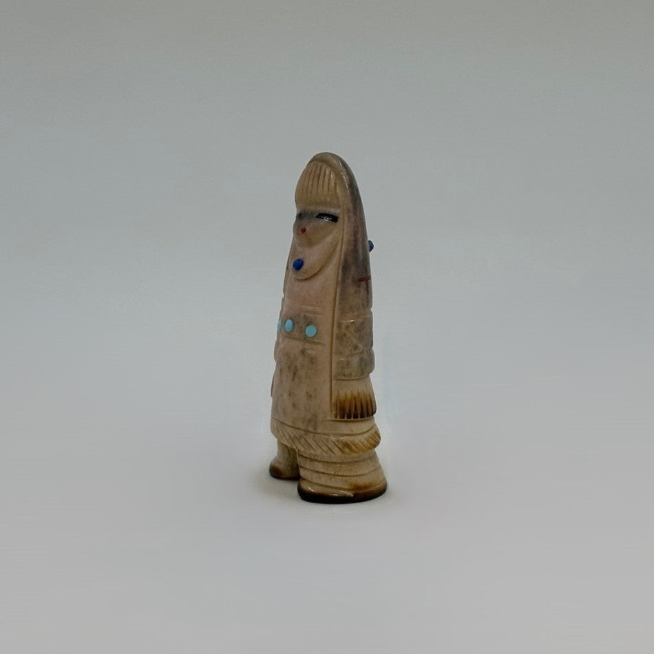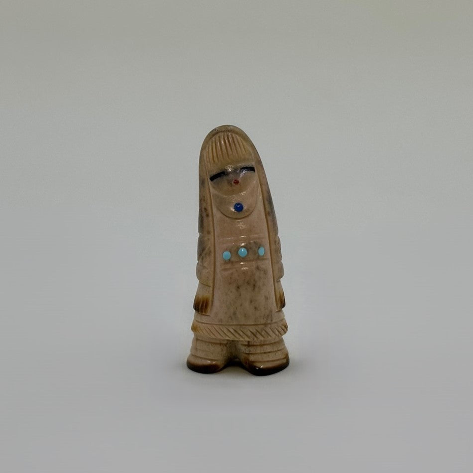 A hand carved Elk Antler Pueblo maiden wearing a traditional shawl. She has perfectly incised hair and eyes. Her eyes are inlaid with Black Jet pigment and red Mediterranean Coral mouth. Her necklace is highlighted with single blue Lapis stone. The belt is inlaid with Sleeping Beauty turquoise. Her shawl is inlaid with blue Lapis. The Dragonflies of Black Jet pigment & Stars of Red Pipestone pigment. Detailed with a geometric pattern and the fringe is burnished for contrast. Her moccasins are carved to show the traditional white buckskin wraps and the soles are burnished for contrast.
