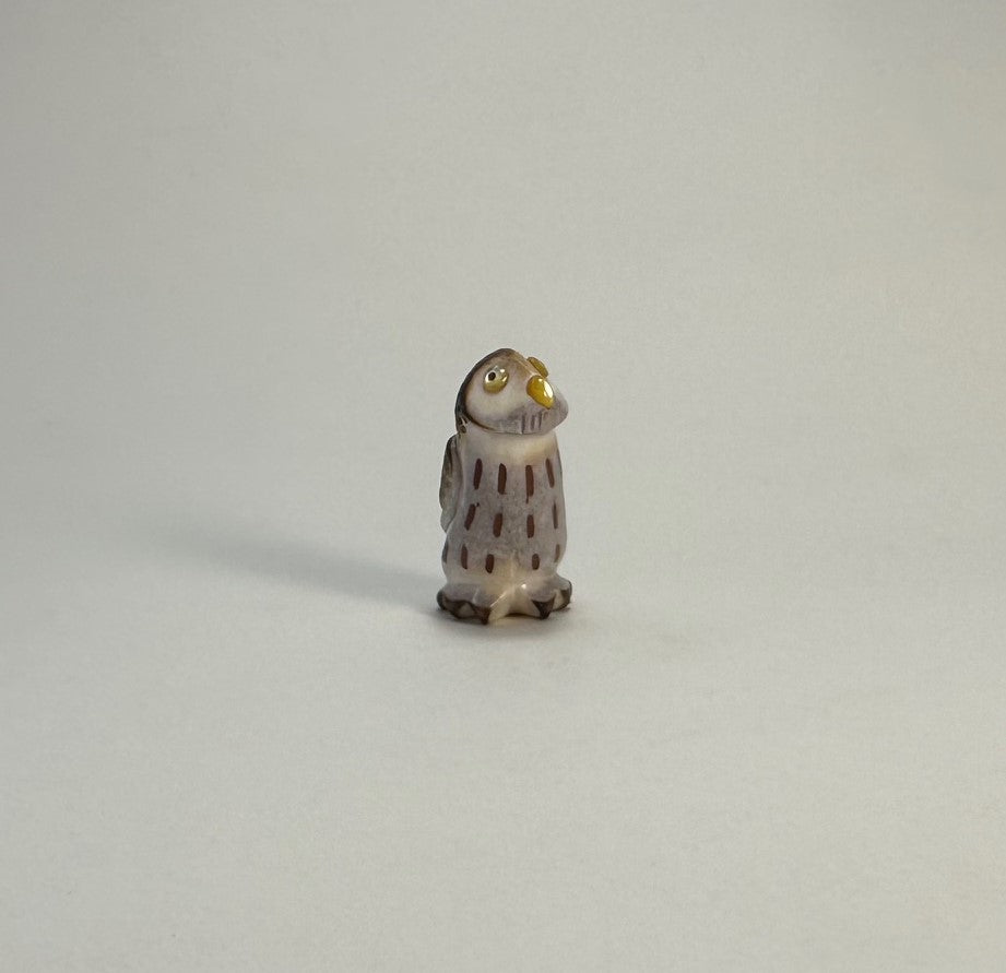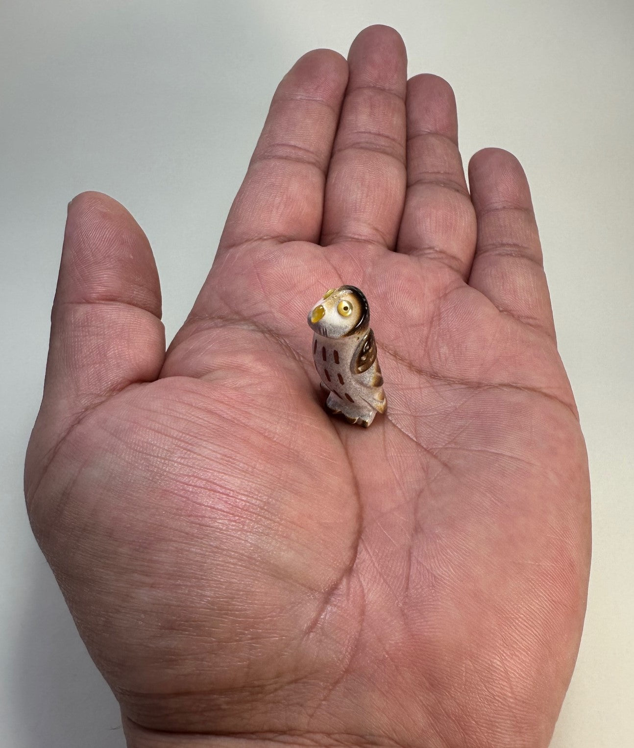 High up in a tree, a hand carved Elk Antler Pygmy Owl sits on a branch hunting. He looks forward with Golden Mother of Pearl and Black Pen Shell eyes. His Golden beak chatters as he focuses on his prey. Long streaks of Red Pipe Stone pigment camouflage his chest and burnished talons, feathers and head hide him well in the tree.