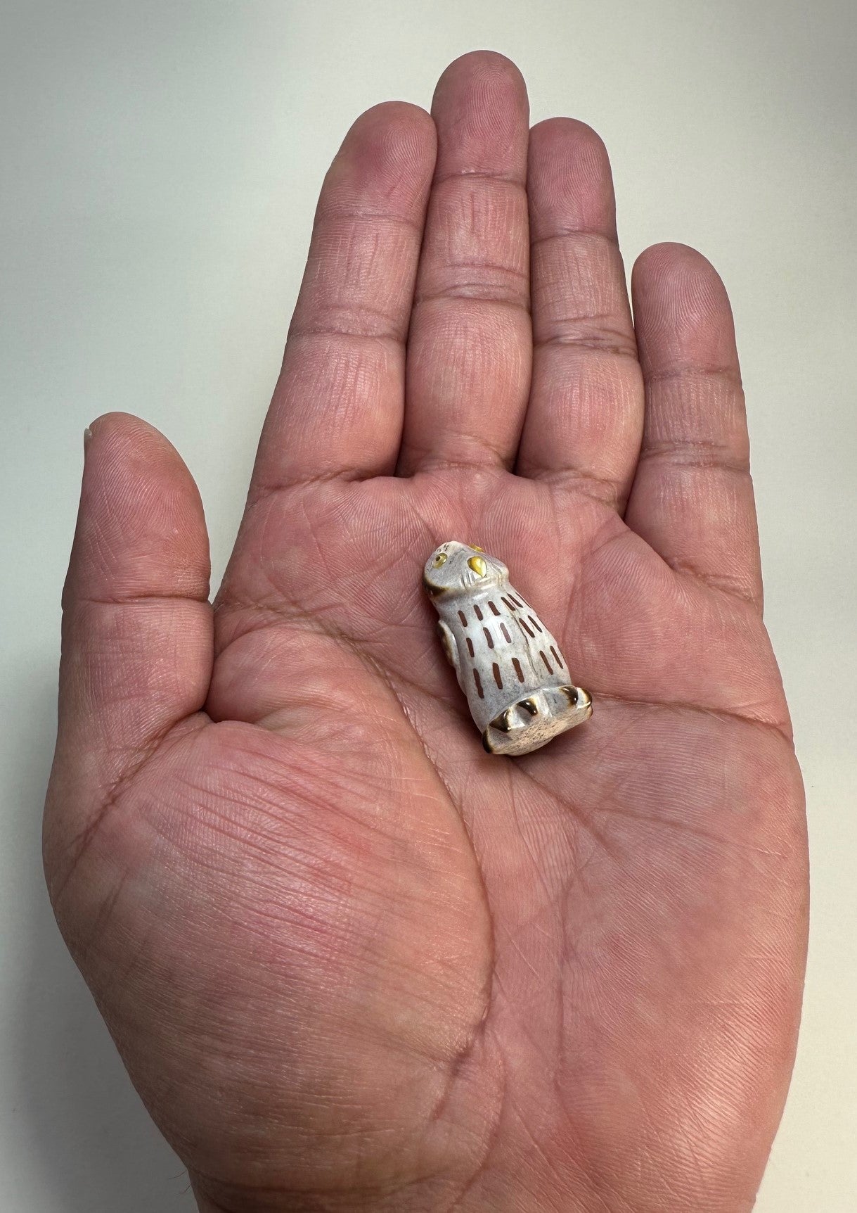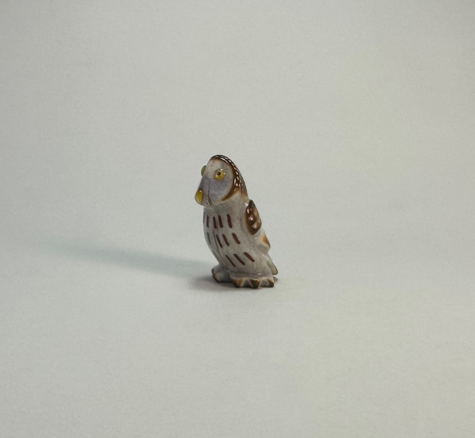 A hand carved Elk Antler Pygmy Owl inlaid with Gold Lip Mother of Pearl and Black Pen Shell eyes with a beak of Gold Mother of Pearl. The chest streaks are inlays of Red Pipe Stone pigment. The talons, feathers, head and edges of the face are burnished to give detail.