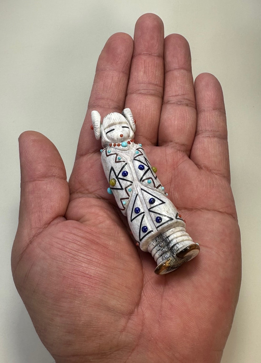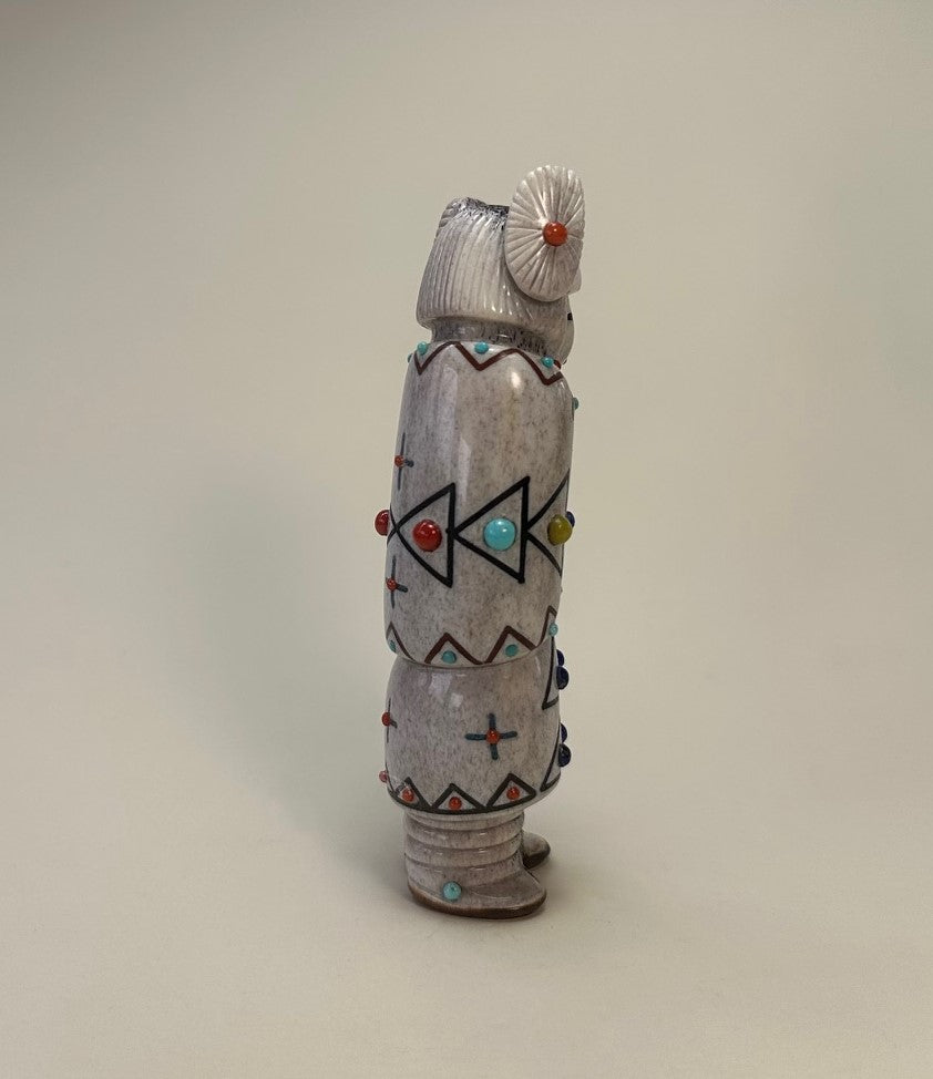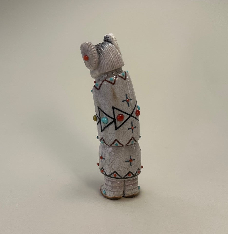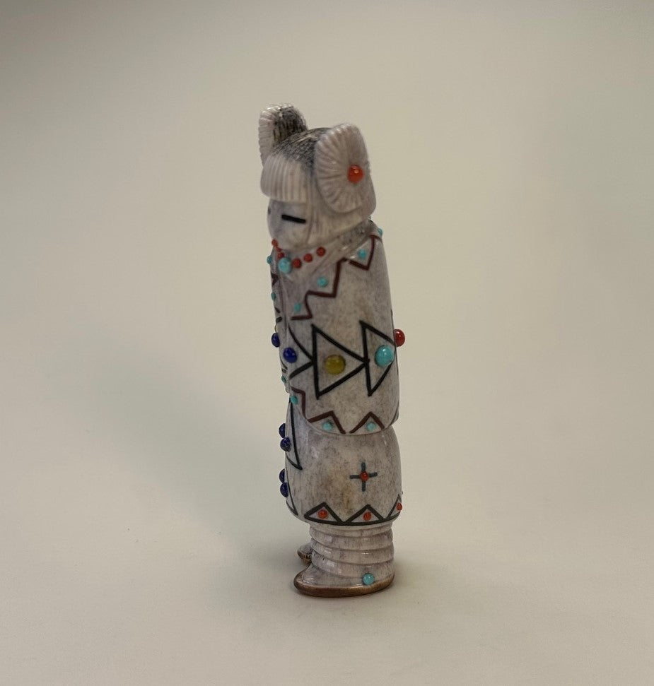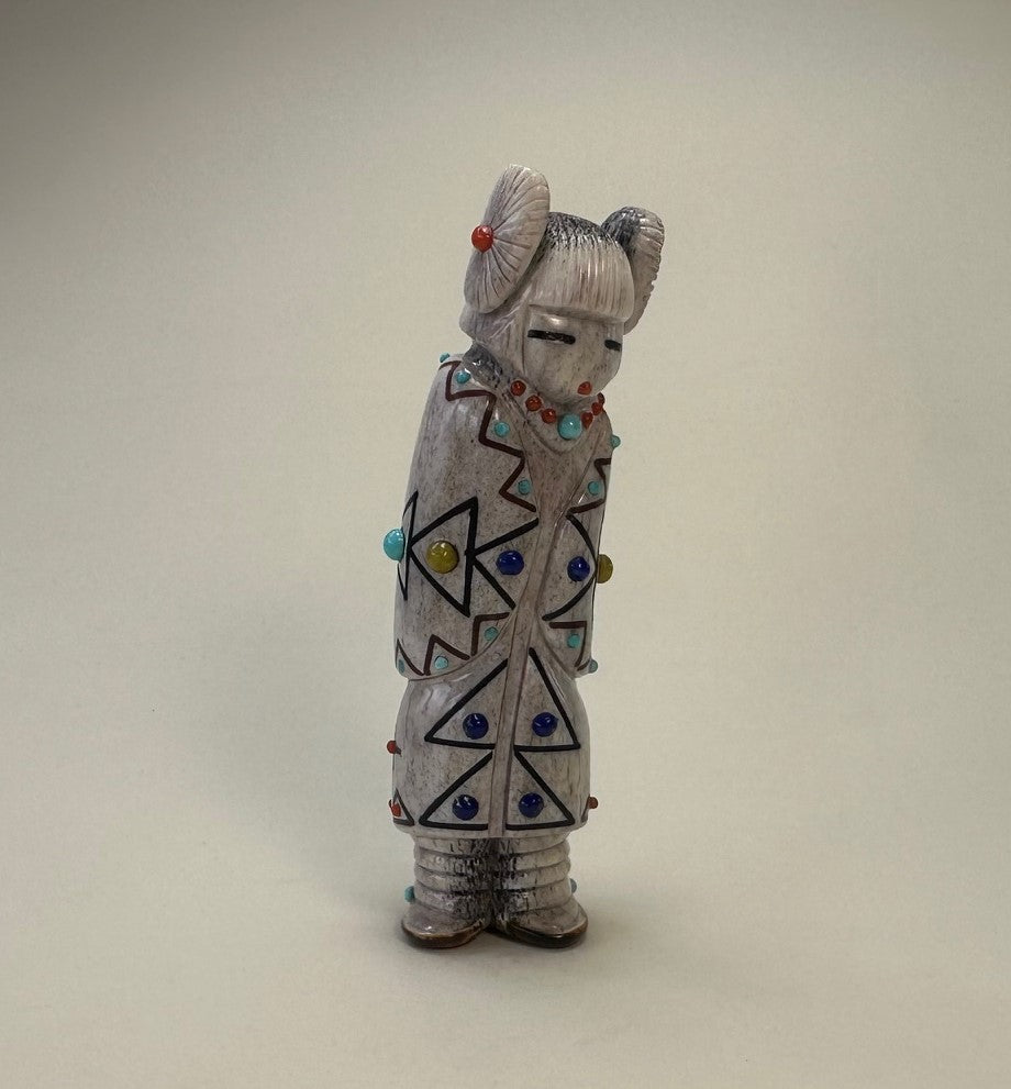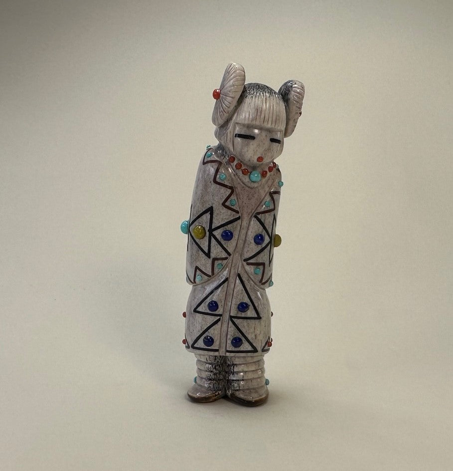 A beautiful sculpted maiden with carefully incised traditional pueblo Hair Whorls inlaid with red Mediterranean Coral. Her eyes are inlaid with Black Jet pigment and a mouth inlaid with red Mediterranean Coral.