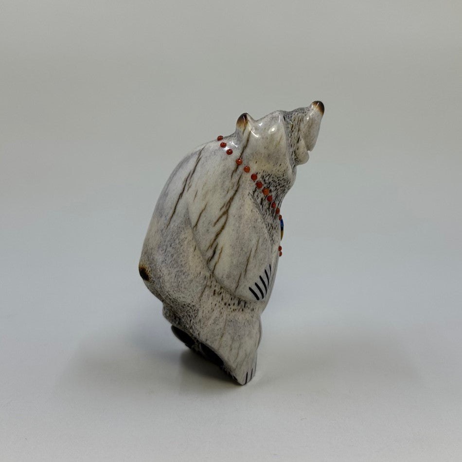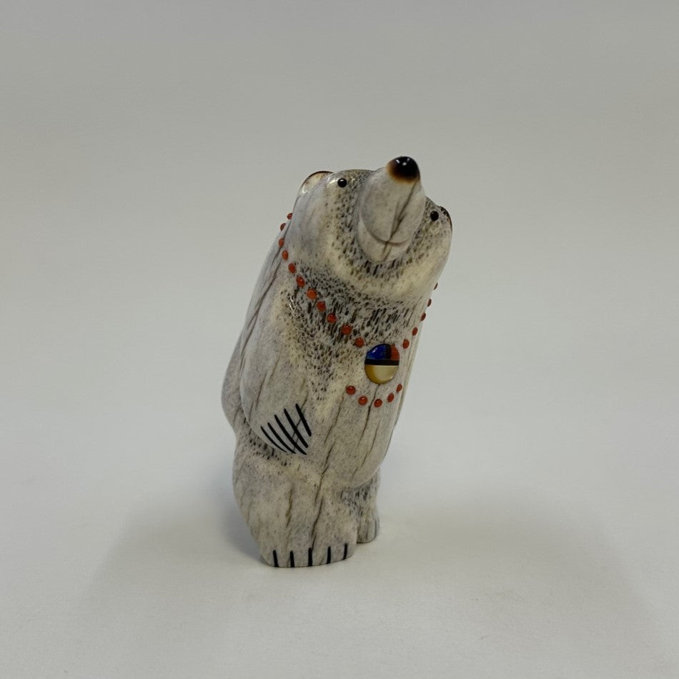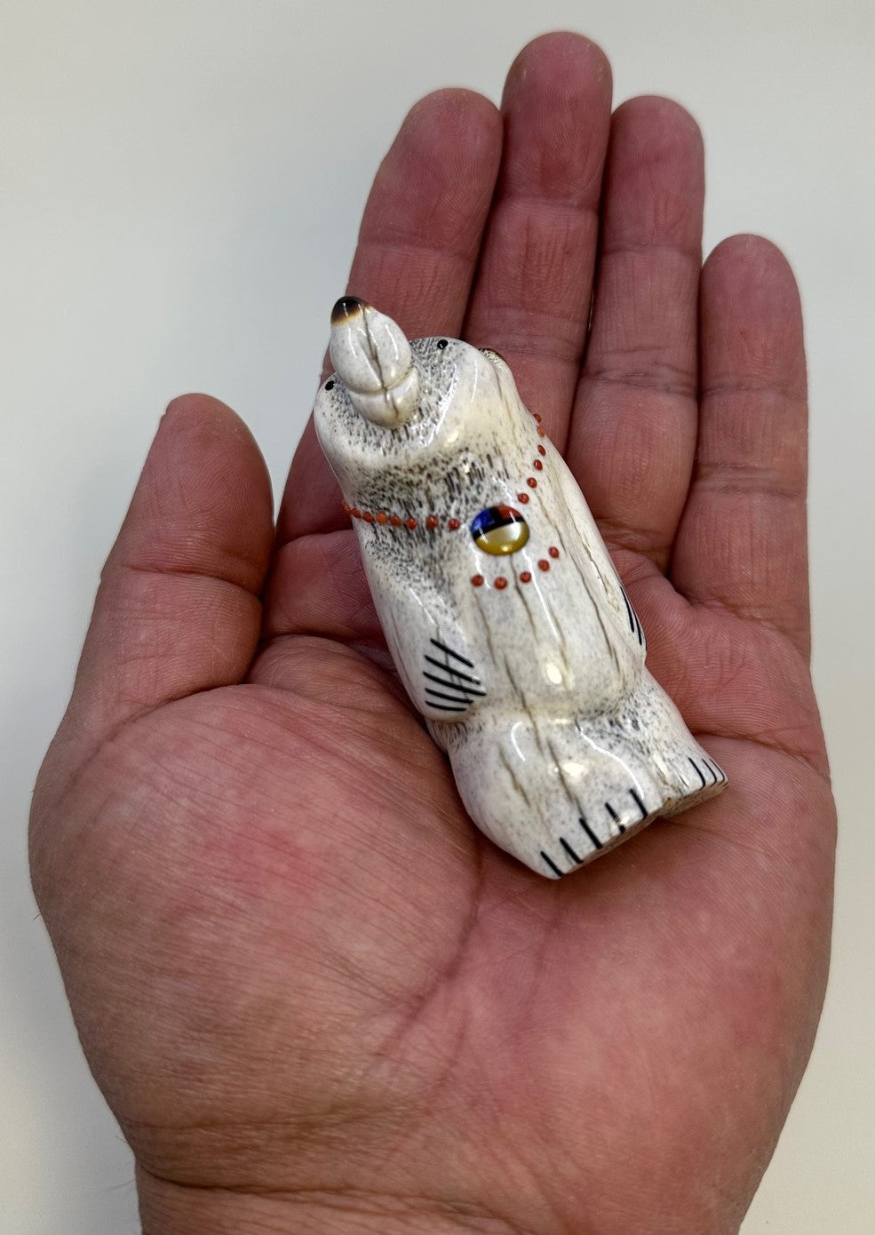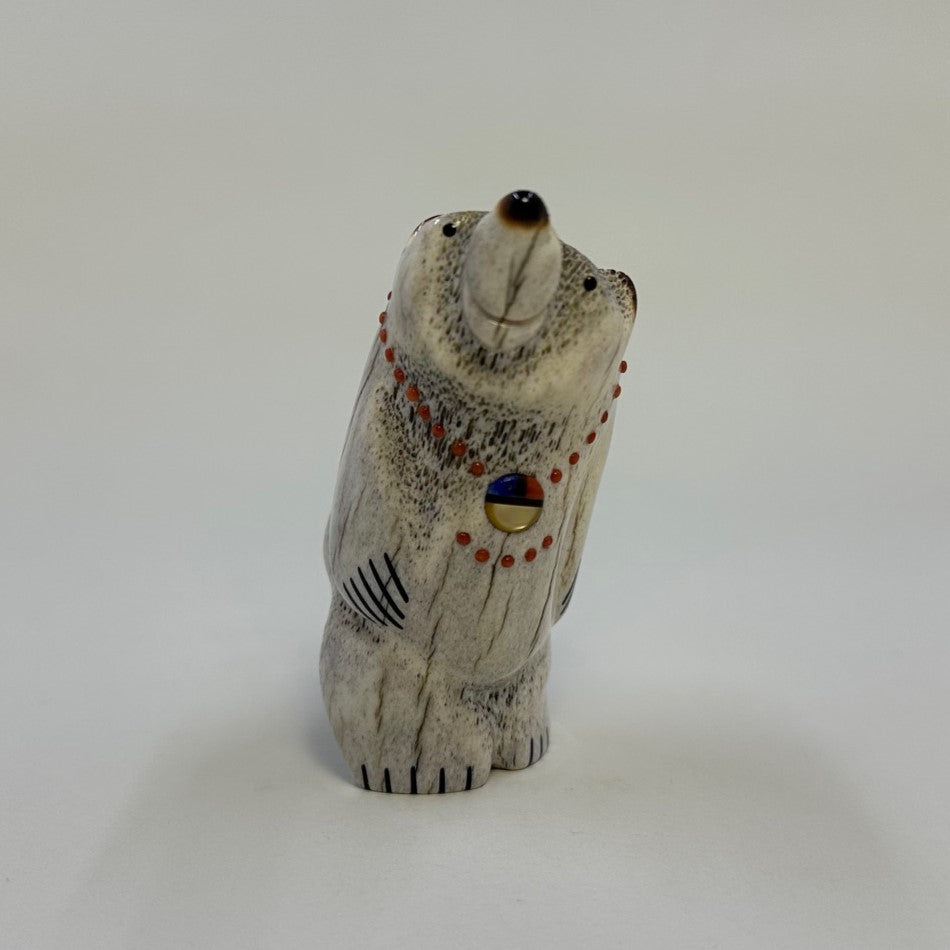 Smiling and on the tips of his paws, this Elk antler bear sees the bee hive with his focused Black Pen Shell eyes. His beautiful necklace is inlaid with a Sun Face centerpiece of Lapis, Black Pen Shell, Mediterranean Coral and Gold Mother of Pearl. The drops and the strand around his neck are Mediterranean Coral. His paw detail are inlaid with Black Pen Shell and the claws are of Black Jet pigment. His nose, ears and tail are burnished to give color and detail.