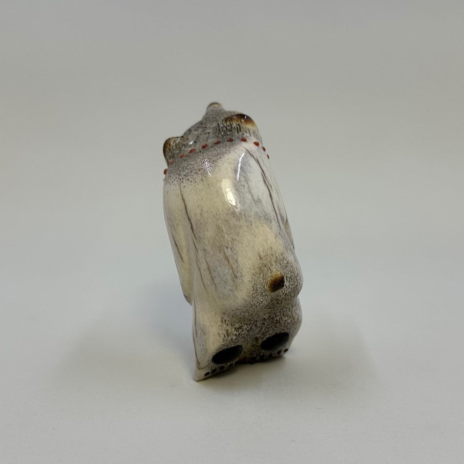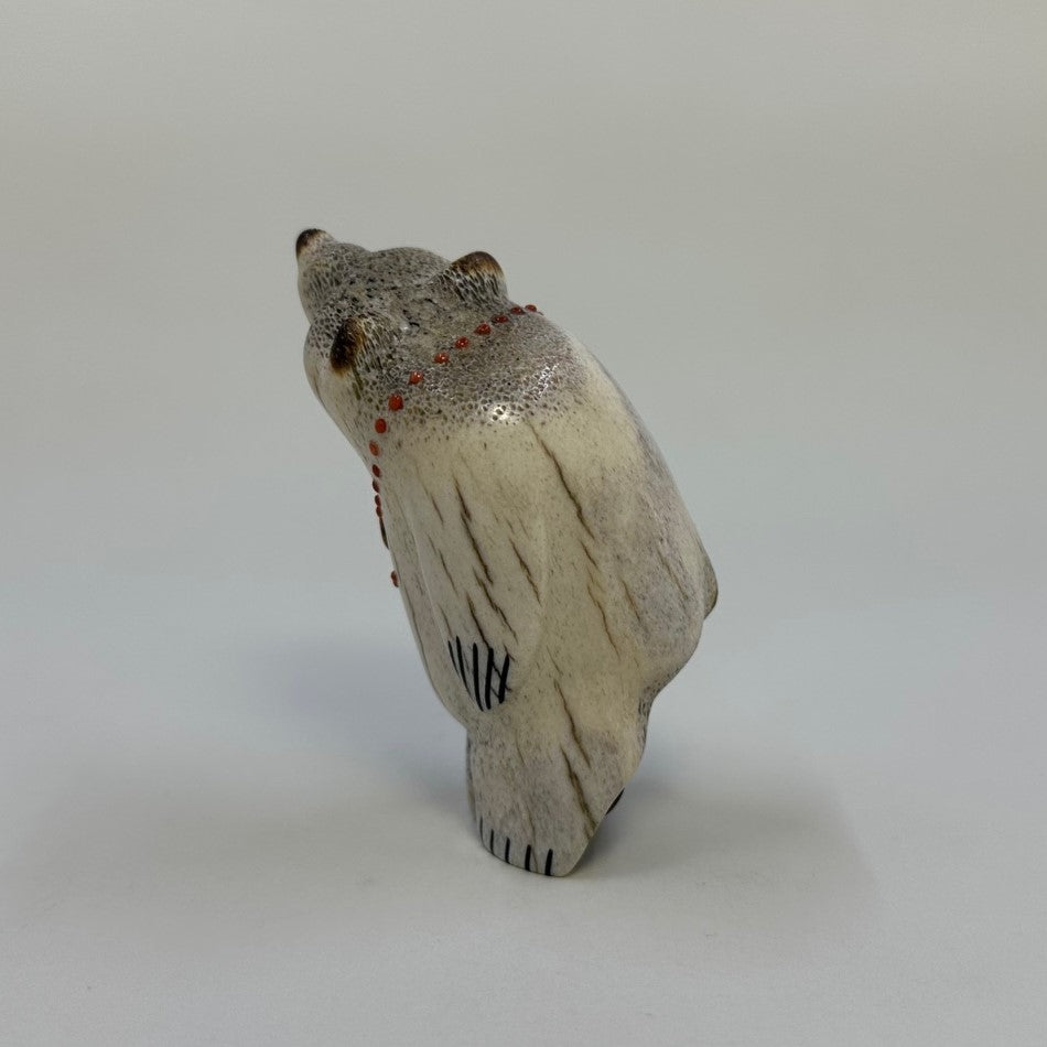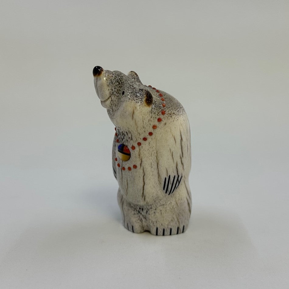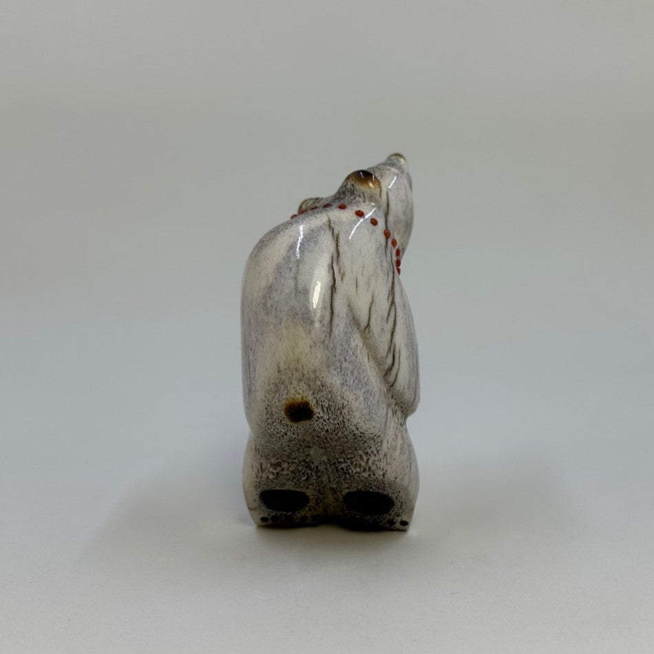 Smiling and on the tips of his paws, this Elk antler bear sees the bee hive with his focused Black Pen Shell eyes. His beautiful necklace is inlaid with a Sun Face centerpiece of Lapis, Black Pen Shell, Mediterranean Coral and Gold Mother of Pearl. The drops and the strand around his neck are Mediterranean Coral. His paw detail are inlaid with Black Pen Shell and the claws are of Black Jet pigment. His nose, ears and tail are burnished to give color and detail.