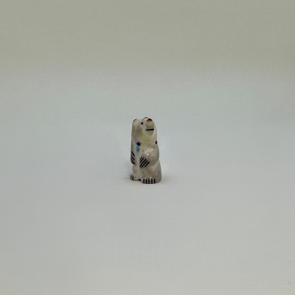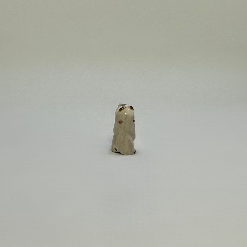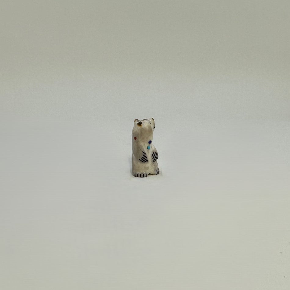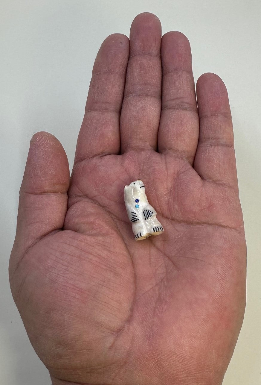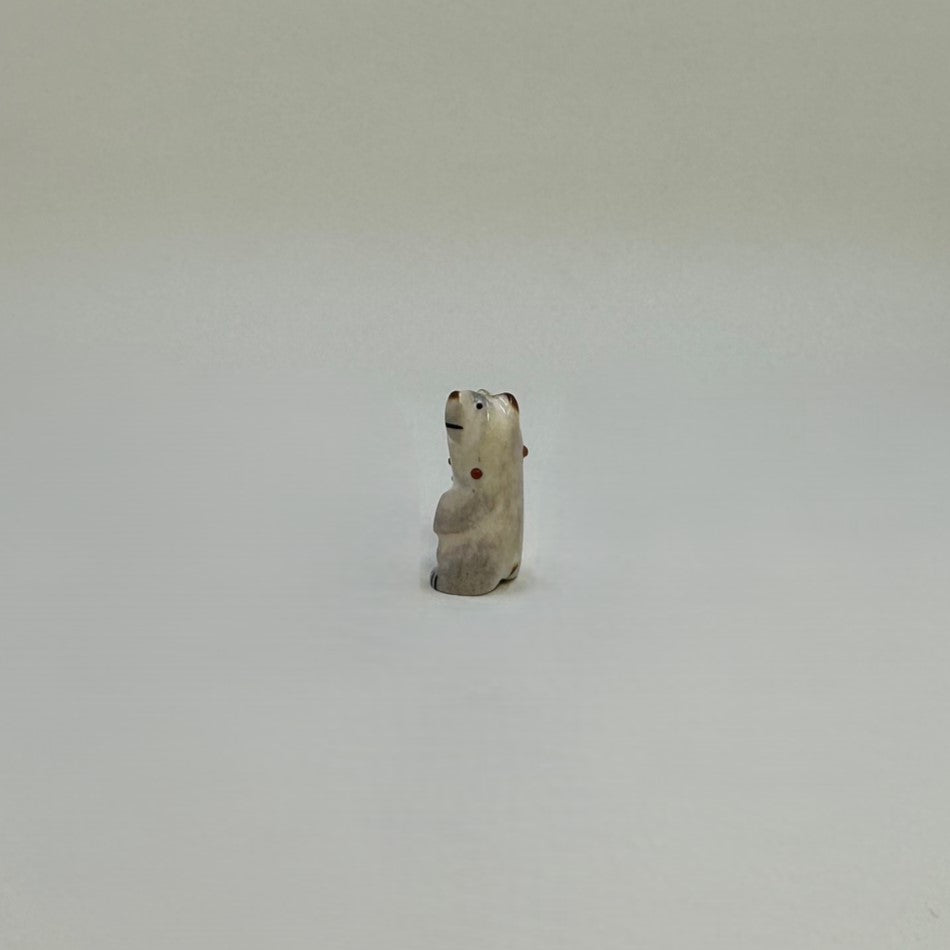 A hand carved Elk Antler bear with curious eyes of Black Pen Shell. He wears a simple necklace of Sleeping Beauty Turquoise, Lapis and Mediterranean Coral. His mouth and claws are inlaid with Black Jet pigment and the nose, ears and tail are burnished for color and detail.