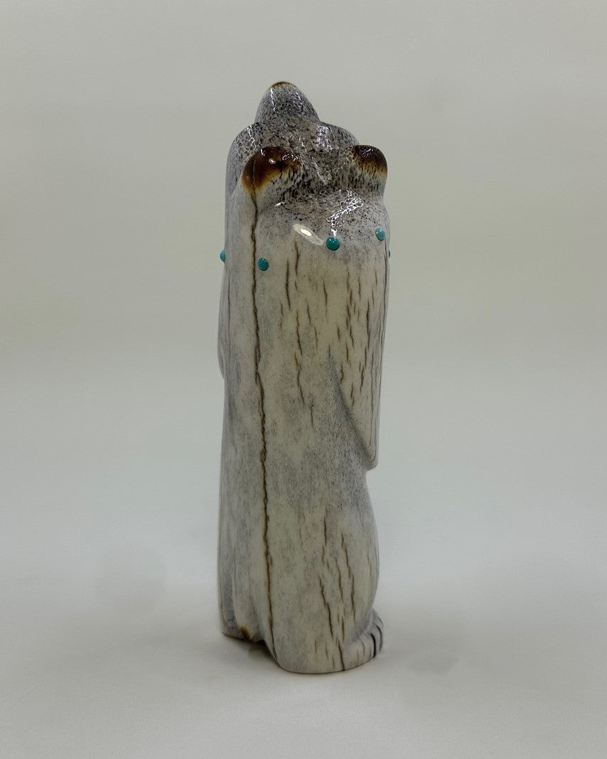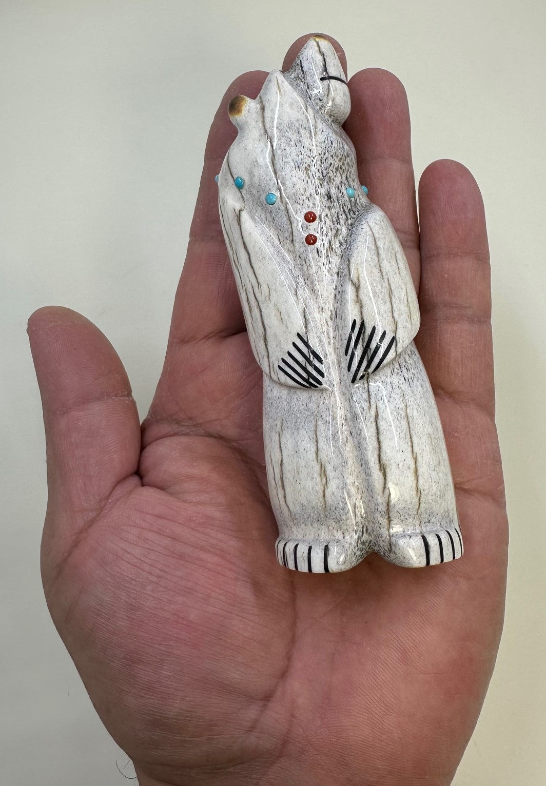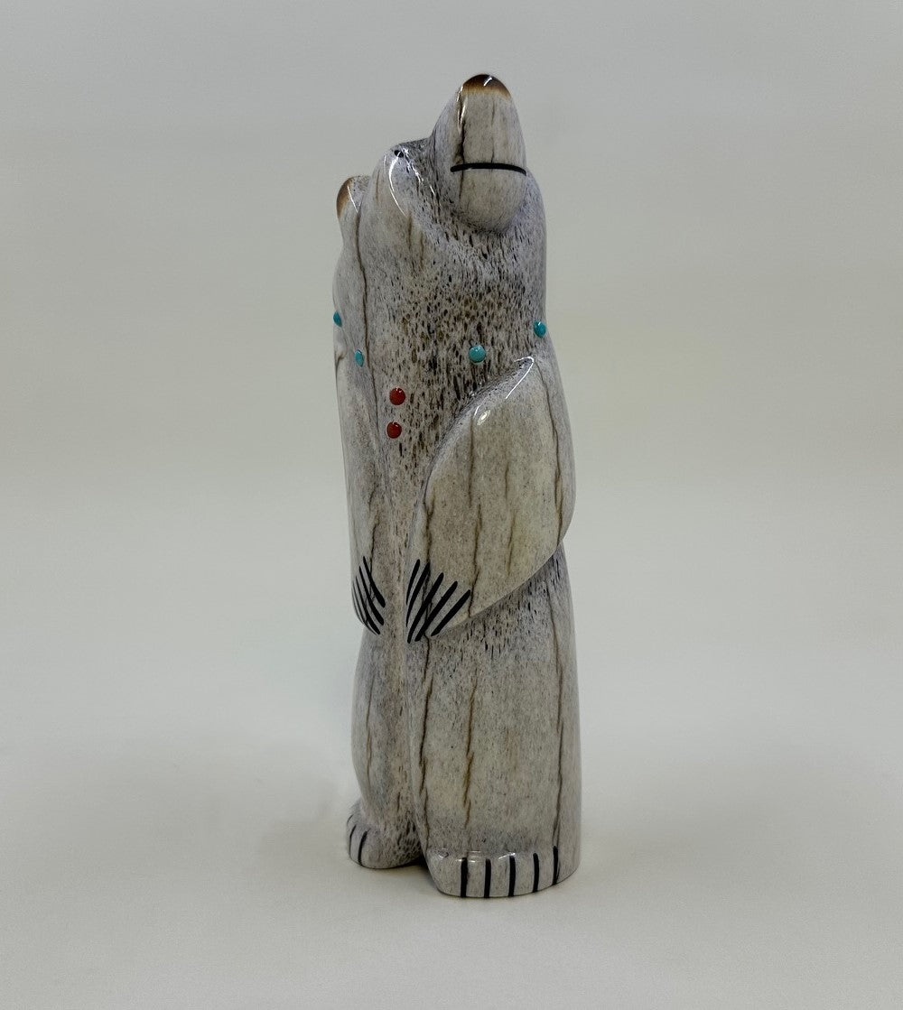 Hand carved of Elk Antler with Black Pen Shell eyes. His necklace is inlaid with Mediterranean Coral and Sleeping Beauty Turquoise. The mouth and claws are inlaid Black Jet pigment. The finishing touch is the burnished nose, ears and tail.