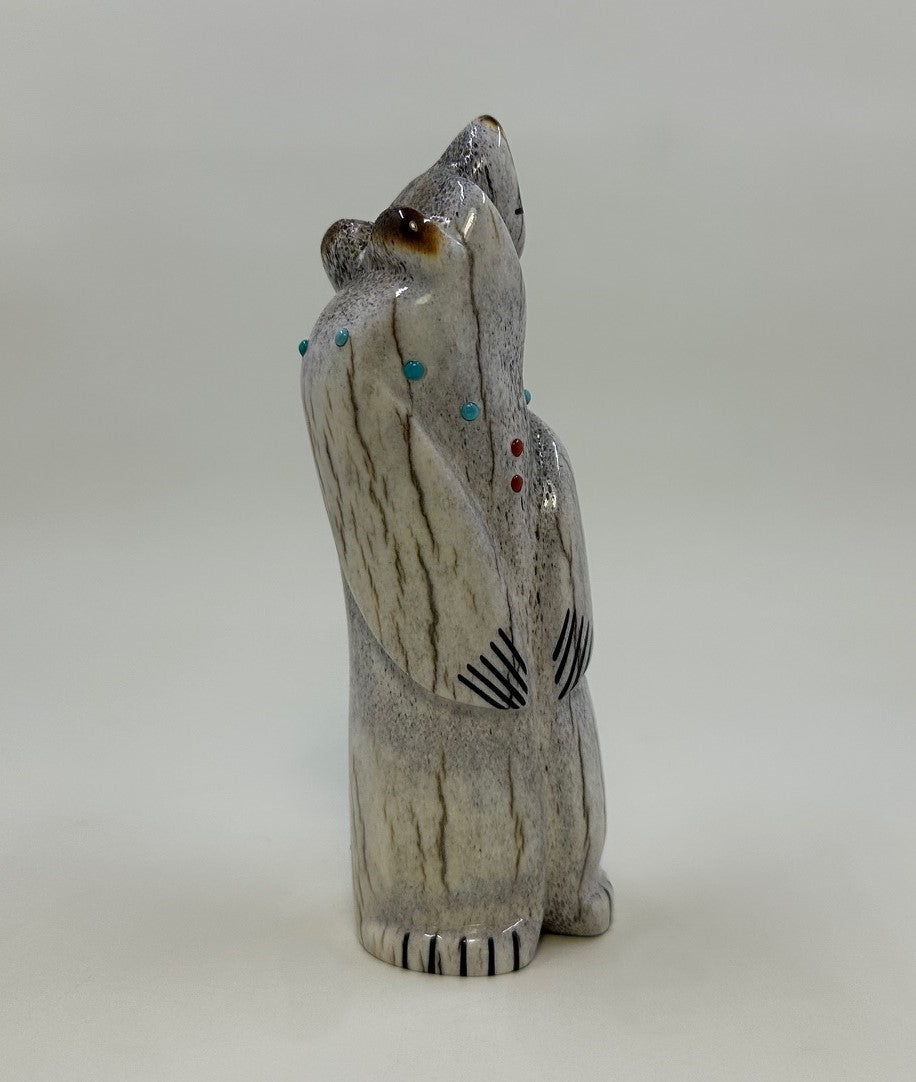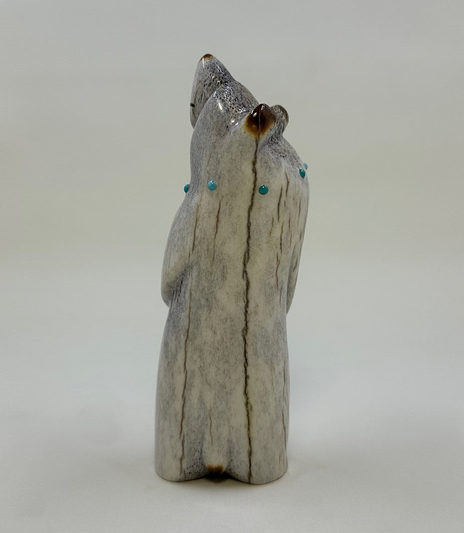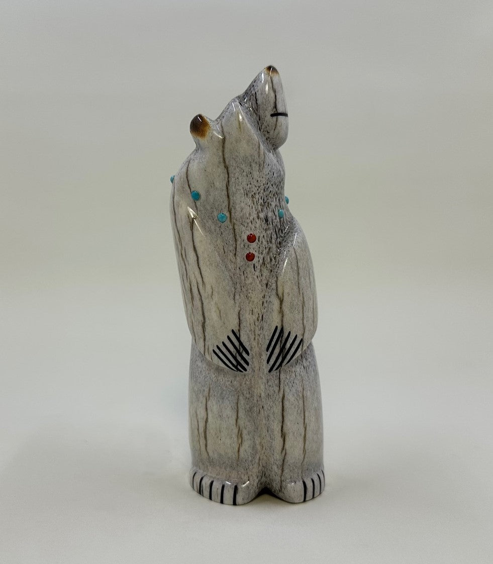 Hand carved of Elk Antler with Black Pen Shell eyes. His necklace is inlaid with Mediterranean Coral and Sleeping Beauty Turquoise. The mouth and claws are inlaid Black Jet pigment. The finishing touch is the burnished nose, ears and tail.